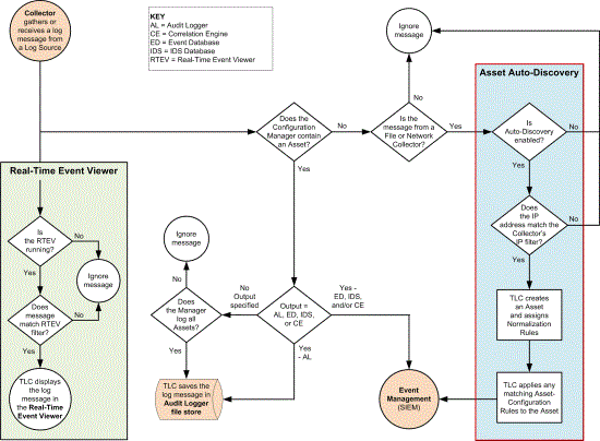 If a File Collector or Network Collector receives a log message from a Log Source for which an Asset does not currently exist, TLC initiates the Auto-Discovery process. The steps below explain how TLC determines if an Asset should be created for the Log Source (outlined in red in Figure 33).