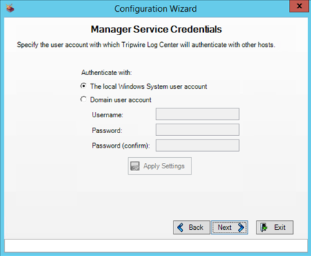 Following installation, you may change this user account. For instructions, see the documentation for the TLC Manager’s Windows operating system. Tripwire recommends that you specify an Administrator account. However, if you want to assign a non-Administrator account, you must complete the steps described in Appendix II. Configuring a Windows User Account to Run the TLC Manager Service following installation. |