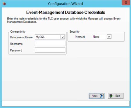 Figure 19. The Event-Management Database Credentials page for MySQL